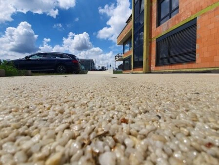 in den Farben TerraCotta und Hellgrau mit Kunststoff ummanteltem farbigen Splitt abgesplittet